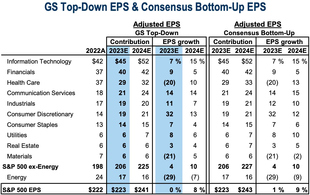 Anaixo, o Goldman Sachs compara o Lucro por Ação (EPS) do mercado de duas maneiras: uma análise "top-down", que olha para fatores econômicos gerais para prever lucros totais, e uma análise "bottom-up", baseada em previsões de lucro para cada empresa feitas por analistas. Esse método oferece uma visão completa, mostrando possíveis diferenças entre expectativas macroeconômicas e análises específicas de empresas, ajudando a entender melhor o otimismo ou pessimismo do mercado.