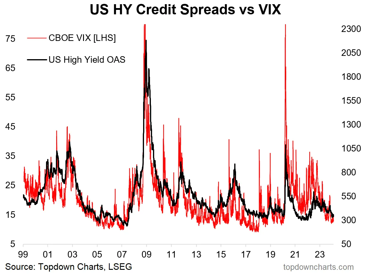 Dada a forte correlação entre o índice VIX (que mede a volatilidade do mercado de ações) e o spread de rendimento de alto risco (que indica a diferença de rendimento entre títulos de alto risco ( High Yield ) e títulos do governo, considerados de baixo risco), atualmente não estão indicando uma iminente instabilidade financeira ou crise.