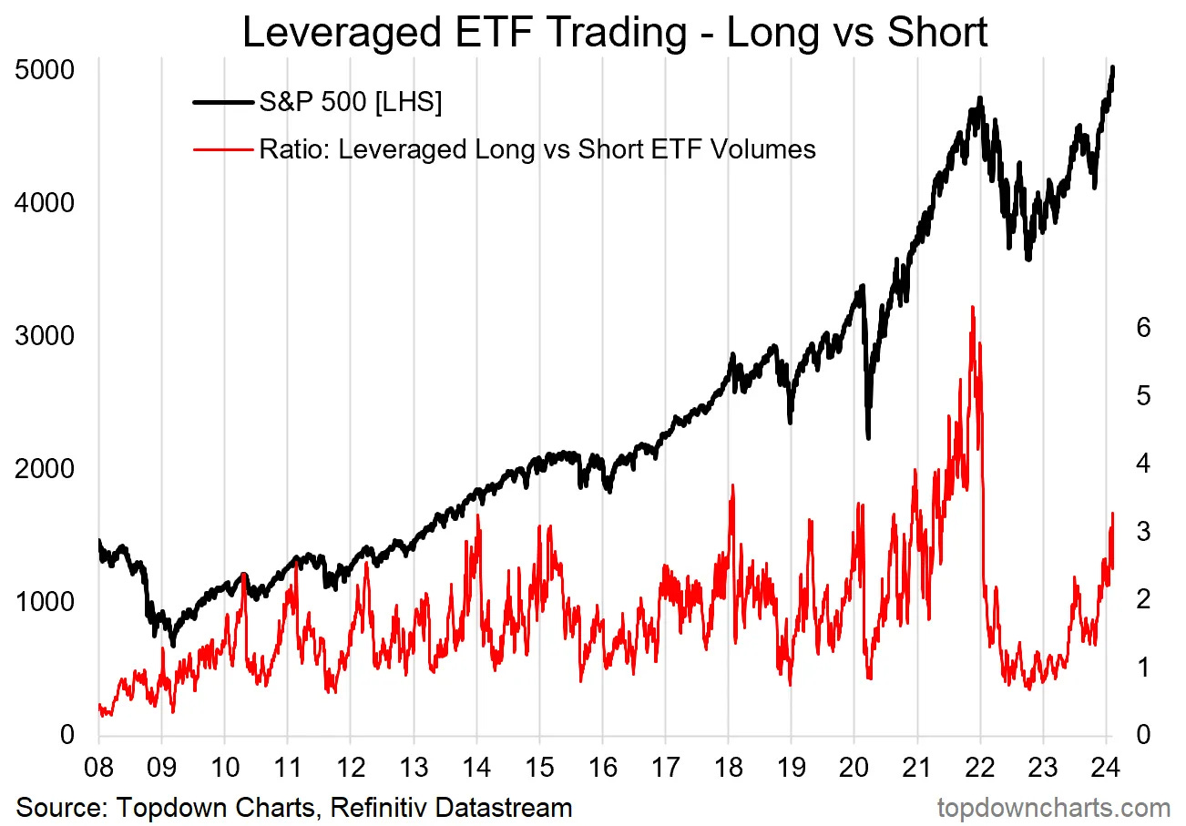 A relação entre os ETFs de long (comprados) e Short (vendidos) parece refletir o excesso de otimismo que estamos observando no mercado americano. Essa medida, ao mostrar uma preferência por posições otimistas (longa) em relação às pessimistas (shorts), indica que os investidores estão inclinados a acreditar na continuação da tendência de alta do mercado. Esse indicador pode ser um sinal de alerta, pois excessos de otimismo frequentemente precedem correções de mercado, quando as expectativas não se alinham com os fundamentos econômicos reais.