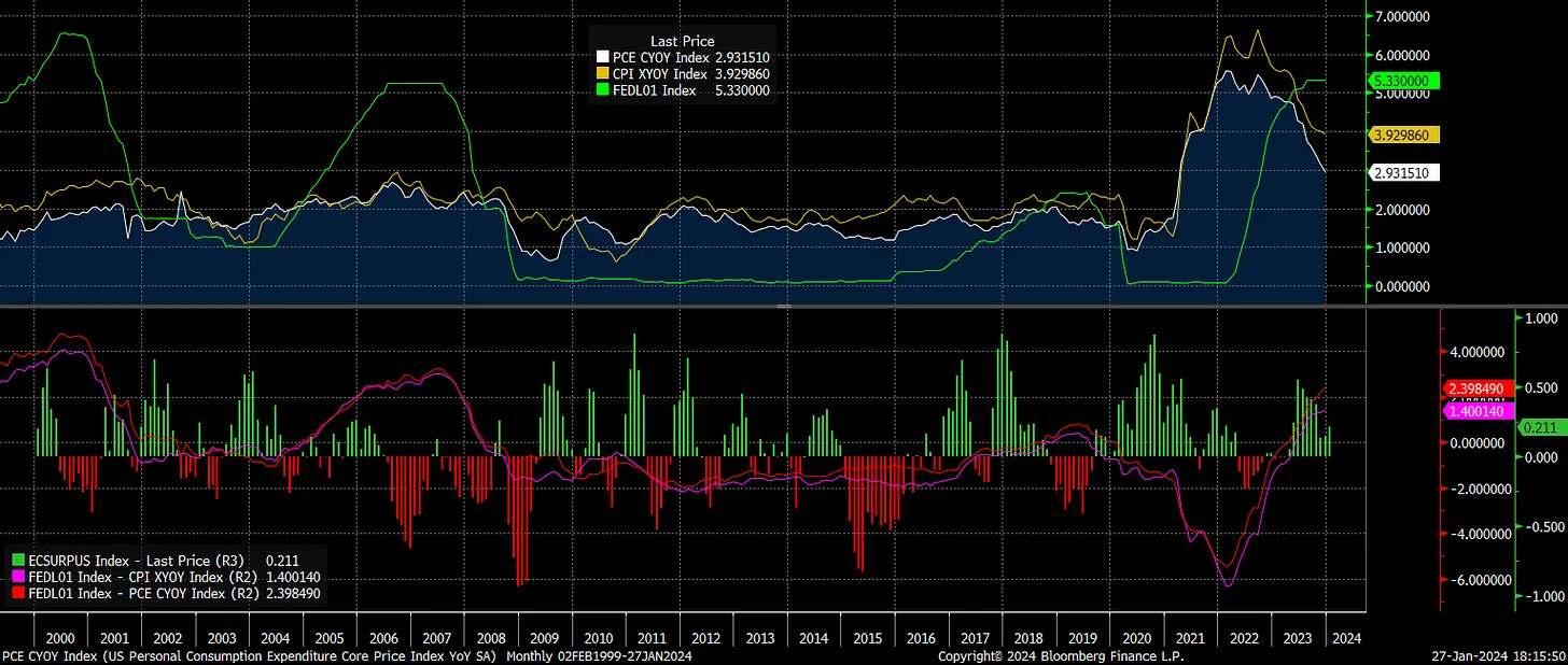 O ponto crucial para se observar no gráfico a seguir é a diferença (spread) entre as taxas dos fed funds e a inflação. O Fed reconhece que a taxa de juros está significativamente acima dos níveis atuais do CPI núcleo e do PCE núcleo. No gráfico apresentado, o PCE núcleo, o CPI núcleo e as taxas dos Fundos Federais são exibidos no painel superior. No painel inferior, é mostrado o spread entre as taxas dos Fed Funds e as duas medidas núcleo. Além disso, o índice de Surpresa de Crescimento Econômico da Bloomberg (em verde/vermelho) é utilizado como uma medida aproximada para o crescimento.