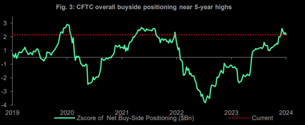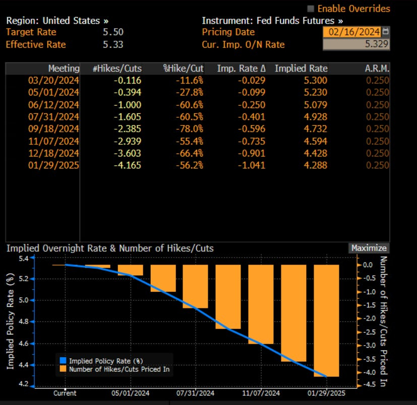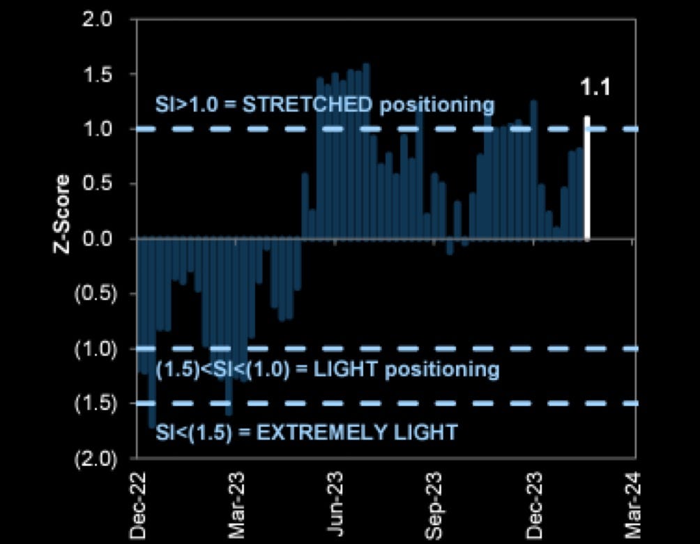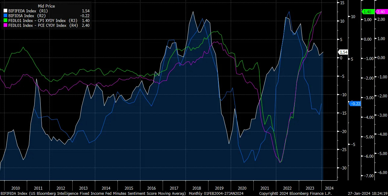 Se o crescimento permanecer resiliente, é provável que o Fed vise um spread maior e, potencialmente, realize 3 a 4 cortes de taxa este ano. Se o crescimento começar a desacelerar, isso provavelmente fornecerá maior confirmação para o Fed realizar de 5 a 6 cortes. Os spreads entre a taxa dos fed funds e a inflação núcleo podem ser comparados aos índices de sentimento das observações iniciais e das atas do Fed. Os índices de sentimento estão indicando um spread menor: