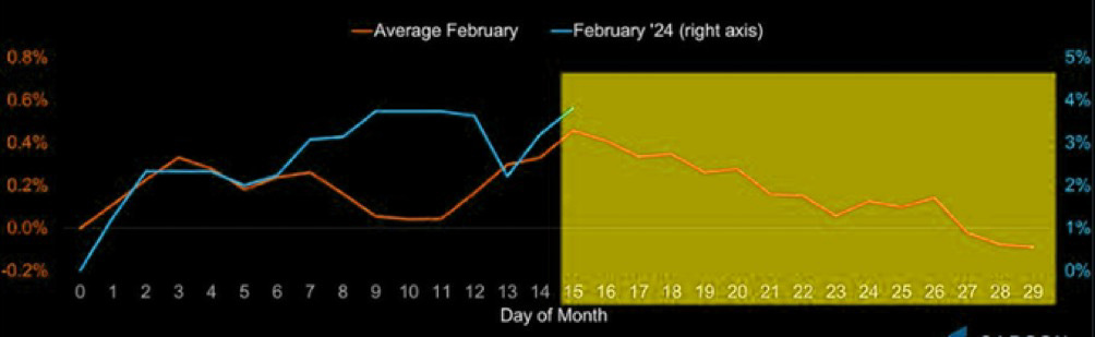 A sazonalidade para o restante do mês de fevereiro não é favorável. Isso implica que, historicamente, este período do mês tende a apresentar desempenhos mais fracos ou negativos nos mercados financeiros, segundo padrões observados em anos anteriores.