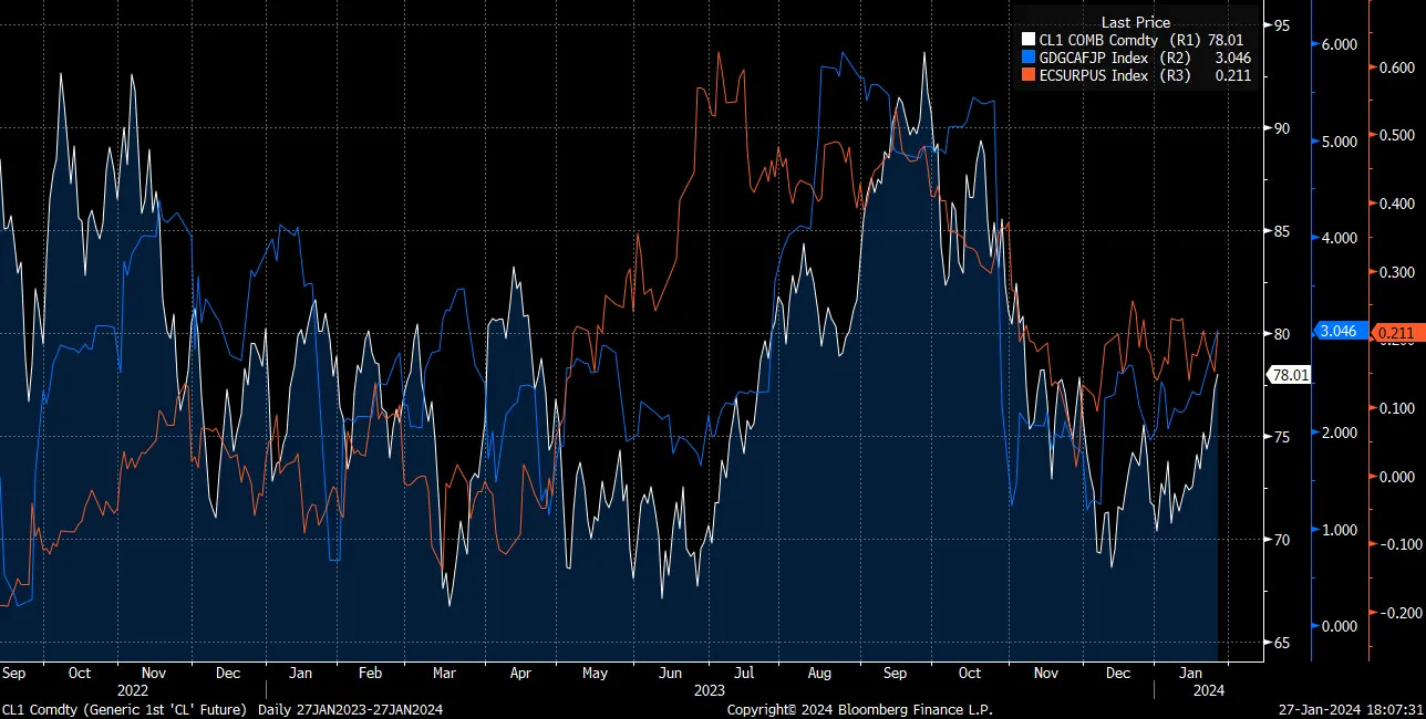 A principal razão para a divergência de curto prazo entre os números centrais e gerais deve-se ao componente de energia. Os preços da energia têm se movimentado em sincronia com os indicadores positivos de crescimento. Aqui está um gráfico do petróleo bruto (branco), o Nowcast do PIB do Fed de Atlanta (azul) e o índice de surpresa de crescimento econômico da Bloomberg (laranja).