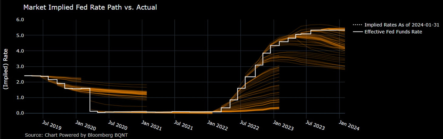 No entanto, esse caminho esperado raramente é preditivo do que realmente acontecerá. Aqui está um gráfico da taxa implícita vs atualizada dos Fed Funds: